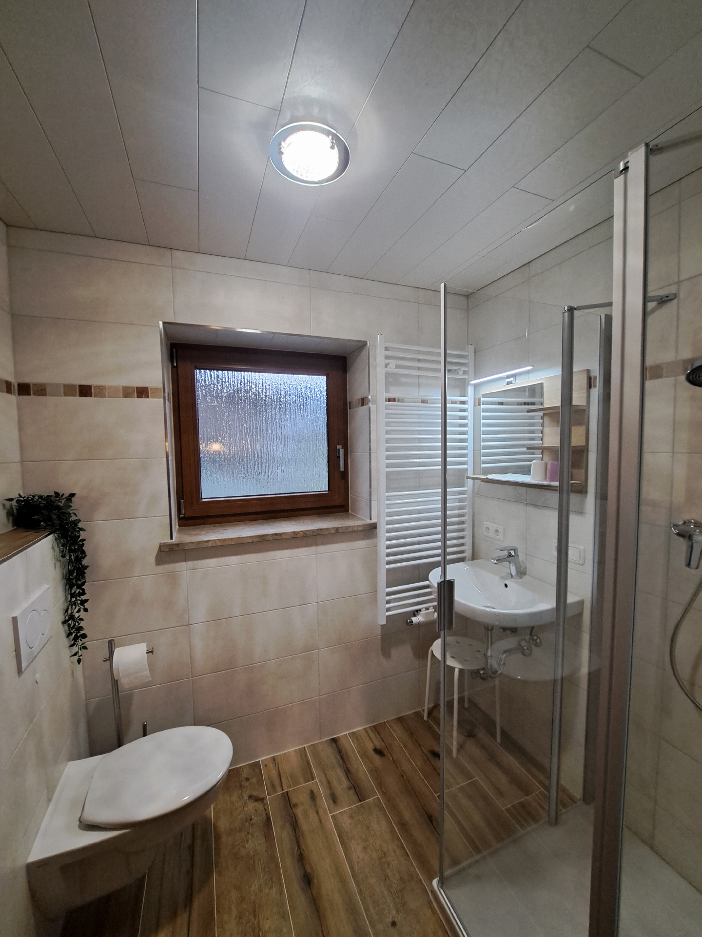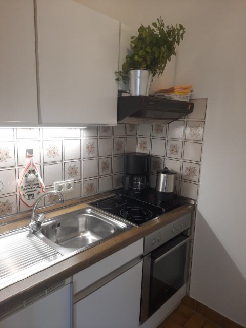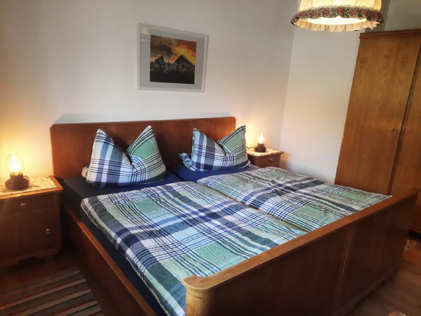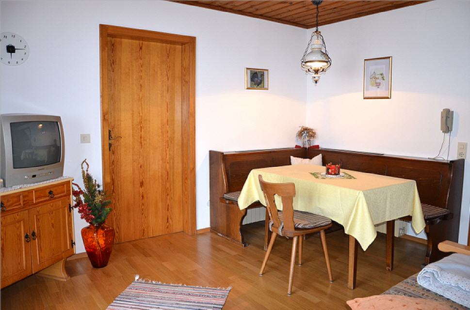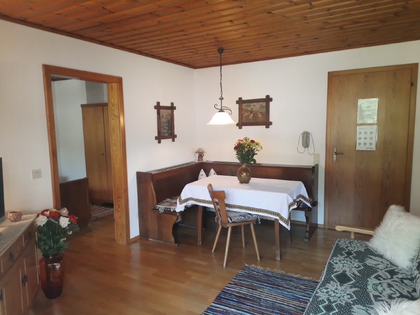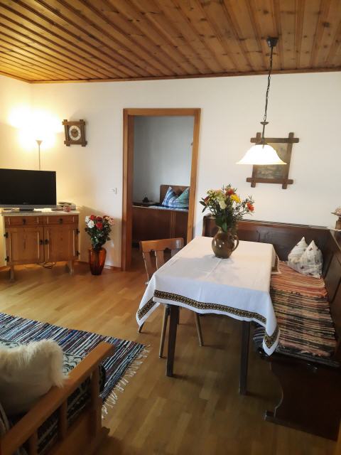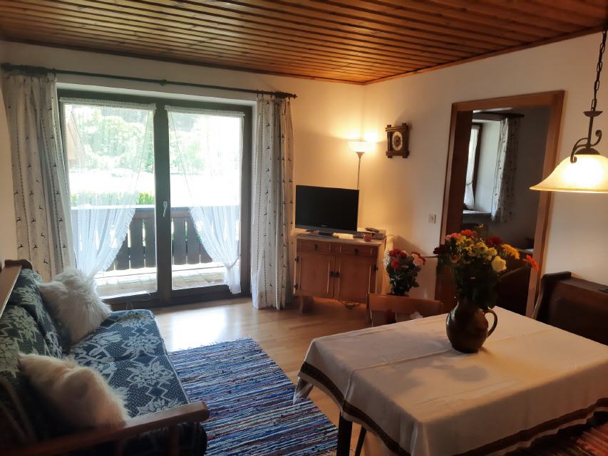 Die Wohnung Kehlstein ist ca. 45 m² groß, mit einem großen Balkon (Sitzgarnitur mit Tisch) nach Süd-Osten und Blick auf die Berge, verfügt über einen liebevoll eingerichteten großzügigen Wohnraum mit Sat-TV und Radio, eine gemütliches Schlafsofa und extra Essecke mit Platz für 2-3 Personen. Auf Nachfrage mit Kinderhochstuhl. Das separate Schlafzimmer mit Doppelbett sorgt für geruhsame Nächte. Ein Kinderbettchen stellen wir auf Wunsch zu Verfügung. Die Küche ist vom Wohnraum abgetrennt und besteht aus E-Herd mit Backrohr, Kühlschrank und verschiedenen Elektrogeräten wie Kaffeemaschine, Toaster, Wasserkocher usw.; es ist genügend Geschirr sowie Kochtöpfe vorhanden. Bad mit Dusche und WC.